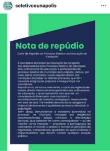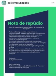 A Carta de Repúdio cobra diálogo, respeito e compromisso do Poder Executivo, alertando para os impactos diretos das decisões adotadas na valorização profissional e na qualidade do ensino público. Entre as principais reivindicações estão a revisão imediata do corte da regência de classe, a simplificação do processo seletivo, a transparência nos critérios e o cumprimento da legislação.