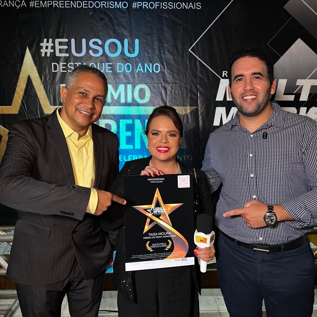 Durante a premiação, a jornalista Taísa Moura, da Nova FM, recebeu o troféu de destaque no rádio jornalismo, em reconhecimento aos relevantes serviços prestados à sociedade regional. A homenagem destaca a atuação da profissional na condução de entrevistas, reportagens e conteúdos voltados à informação de interesse público.