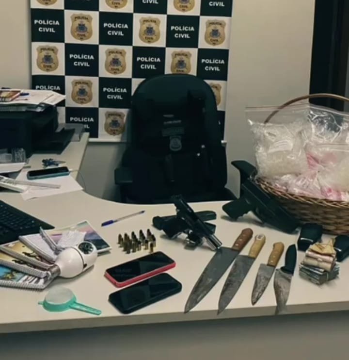 Foram apreendidos uma pistola calibre 9mm, dois carregadores municiados — sendo um alongado com capacidade para 30 munições —, além de 3.030 pinos e três porções médias de cocaína, 1.193 pedras de crack, 2.968 buchas de maconha, 42 buchas de skunk, 250 gramas de haxixe e pés de maconha em cultivo. Também foram recolhidos estufa, fertilizantes, rádio comunicador, sistema de monitoramento por câmeras, dois celulares, liquidificador industrial, balanças de precisão, materiais para embalagem, cadernos com anotações do tráfico, uma motocicleta e dinheiro em espécie.